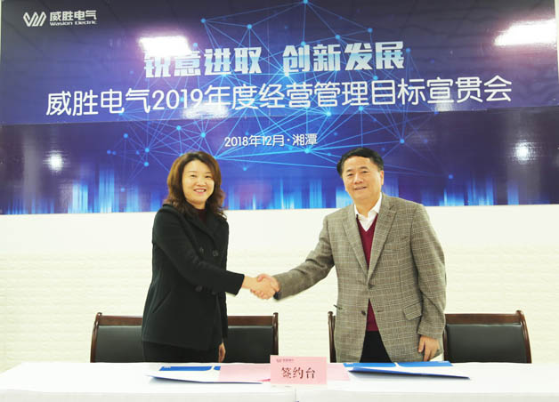 會議第二階段舉行電氣2019年經(jīng)營管理目標簽字儀式:首先,電氣董事長曹朝輝女士鄭重向控股董事會吉主席簽署2019年目標承諾書;隨后,威勝電氣總裁曾辛先生向電氣董事長曹總簽署2019年目標承諾書;