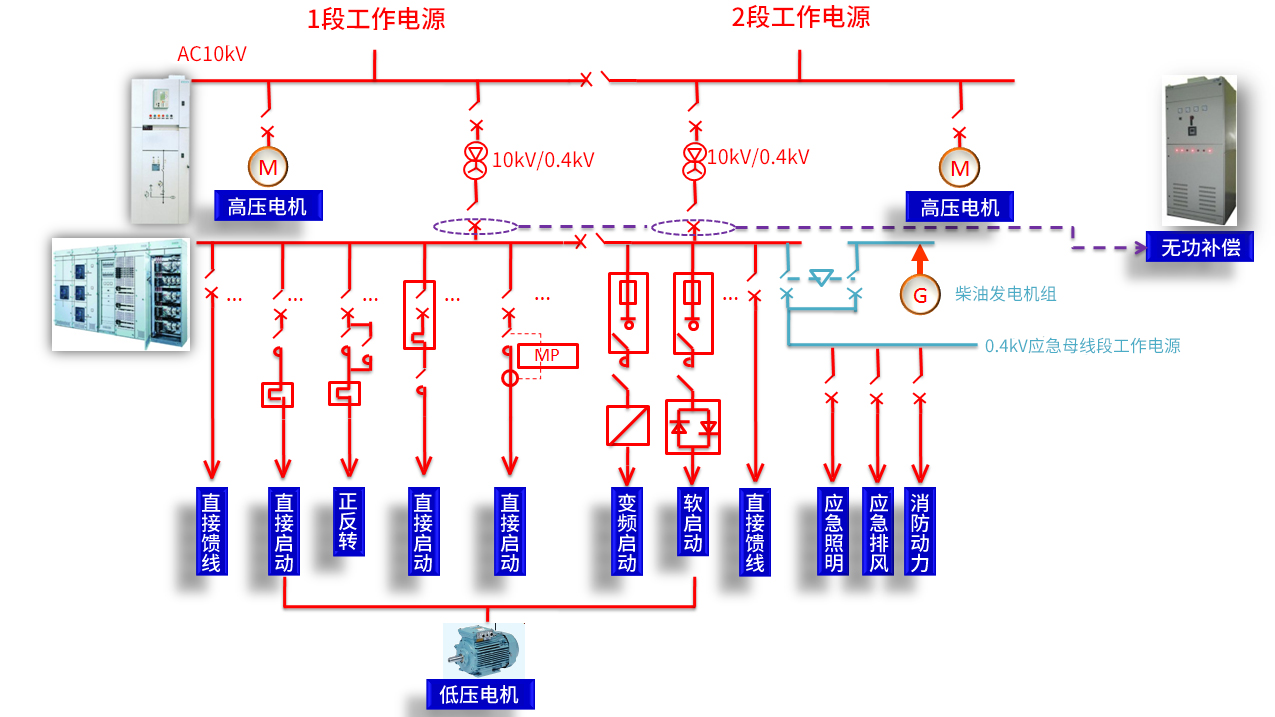 威勝電氣廠礦企業(yè)配電系統(tǒng)解決方案特別針對國內(nèi)廠礦企業(yè)中低壓10KV/0.4KV配電系統(tǒng)。一個雙回路電源進(jìn)線的高壓10KV配電所,正常供電時,分段隔離開關(guān)斷開,兩段母線分別車間變電所供電。在兩端母線上都皆有電壓互感器和避雷器,用于計量和防雷保護(hù)。低壓母線上接有補(bǔ)償無功功率的電容器,以提高工廠功率因數(shù)。廠礦企業(yè)配電解決方案根據(jù)電源以及電能輸送、分配、控制等一次設(shè)備之間的關(guān)系可供設(shè)備包含10KV開關(guān)柜、0.4KV開關(guān)柜及其配套相關(guān)配電設(shè)備。