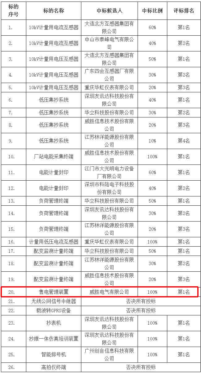 3月9日,中國南方電網官方網站公示了《廣州供電局有限公司2018年營銷計量類物資框架招標結果》,公示顯示:經評標委員會多輪評審,最終推薦了本項目十二個中標候選人,威勝電氣有限公司赫然出現在此份名單中,威勝電氣在“售電管理裝置”這個標的上,以第一名的評標成績,100%的中標比例獨占此標。這條消息讓所有威勝人感到歡欣鼓舞,同時,我們也將繼續努力,繼續致力于讓每一座城市,每一個社區、每一家企業,每一戶家庭都因享用威勝的產品、技術和服務而持久受益!