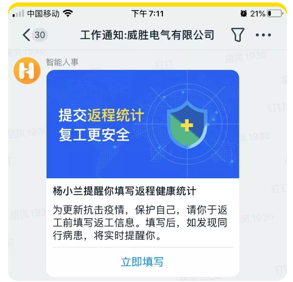通過釘釘、微信群、電話等方式進行日報備、日監測、日排查,落實員工情況監測、更新員工動態與報備員工異常情況,凡14天內由湖北返回的和與確診病人、疑似病例的密切接觸者,實施必要自我居家隔離措施。