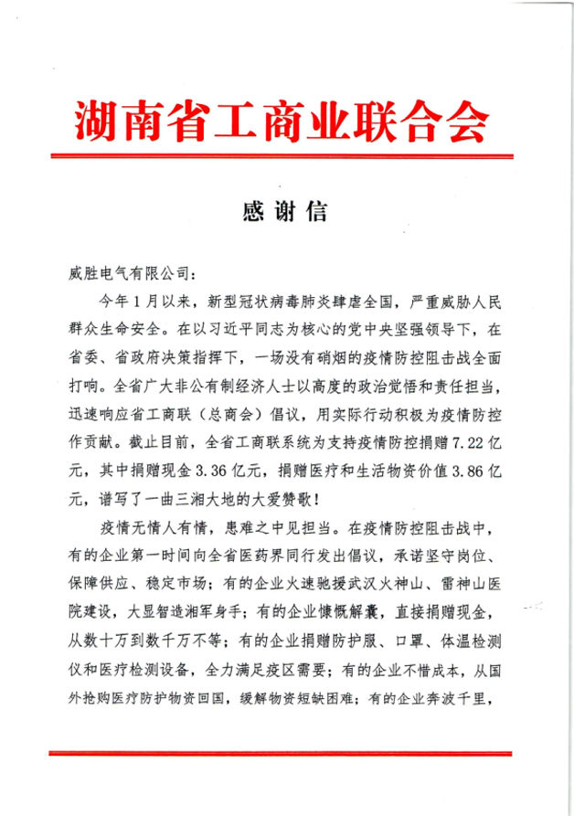 近期,威勝電氣先后收到來自中共湖南省委、湖南省人民政府及湖南省工商業(yè)聯合會的感謝信,信中表達了對威勝電氣在疫情期間馳援一線善舉的肯定與贊揚。