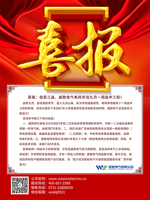 金秋九月,是收獲的季節,進入九月以來,前方市場捷報頻傳,電網市場取得了一周連中三標的佳績,這充分顯示了在2021年三季度經營任務沖刺的關鍵時期,威勝電氣正迸發巨大的活力!